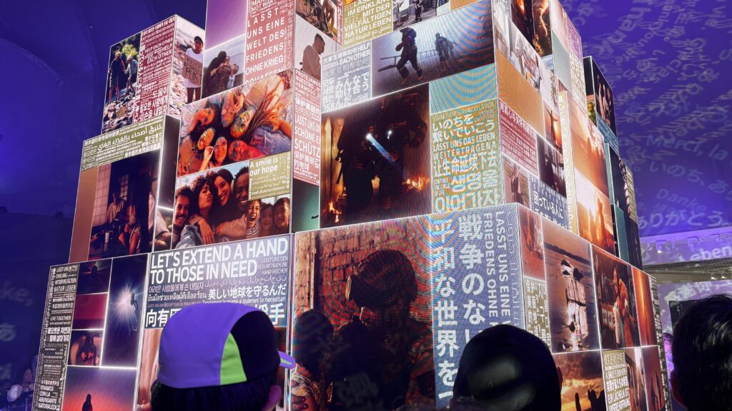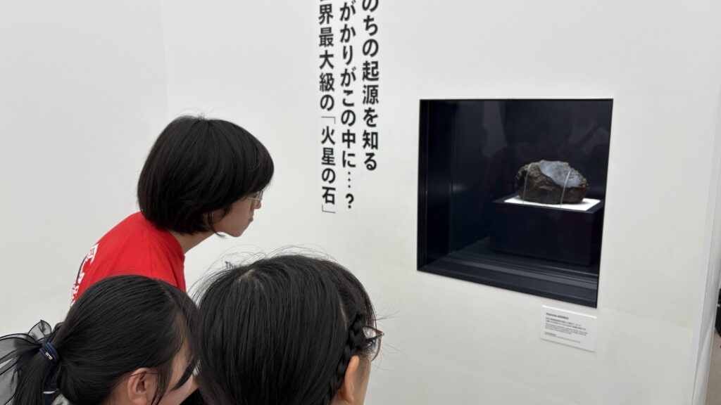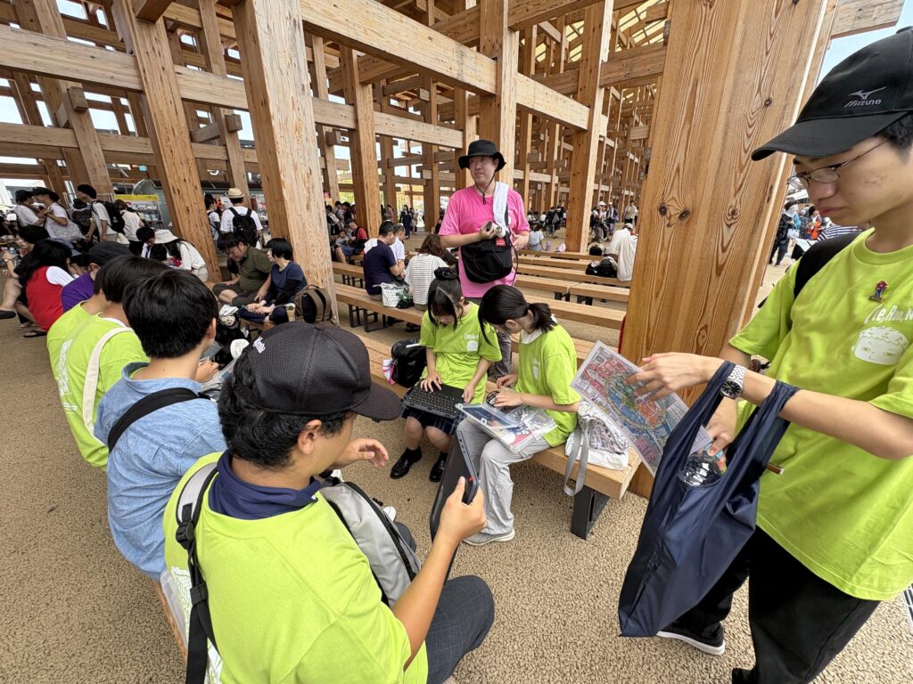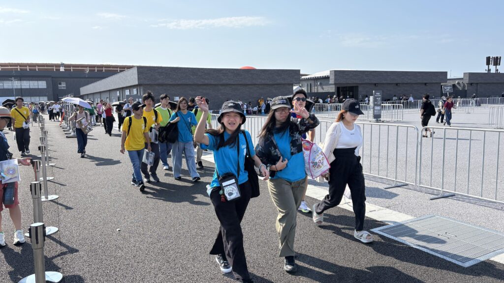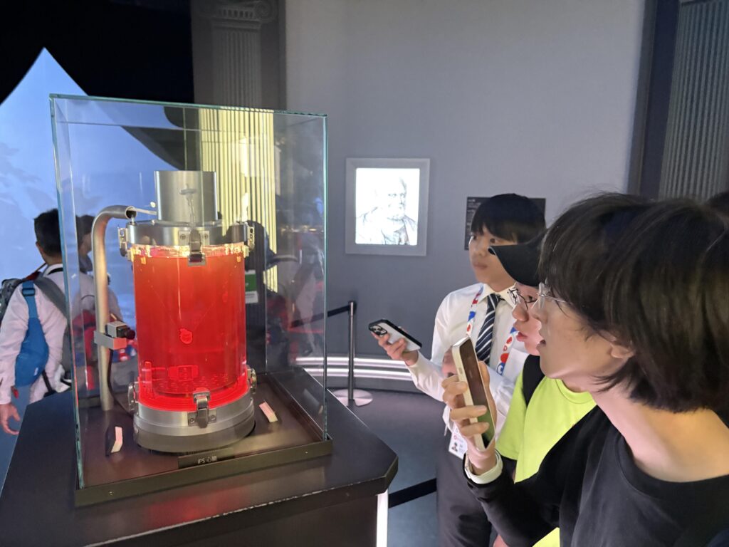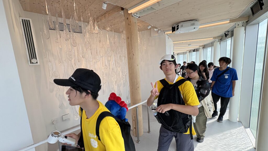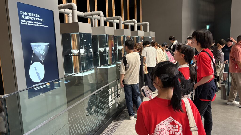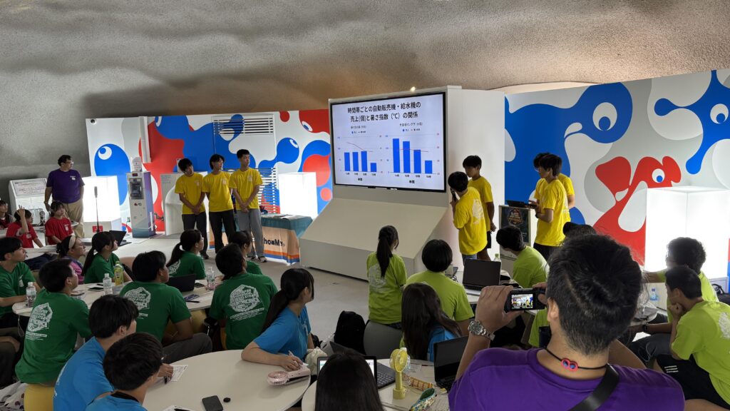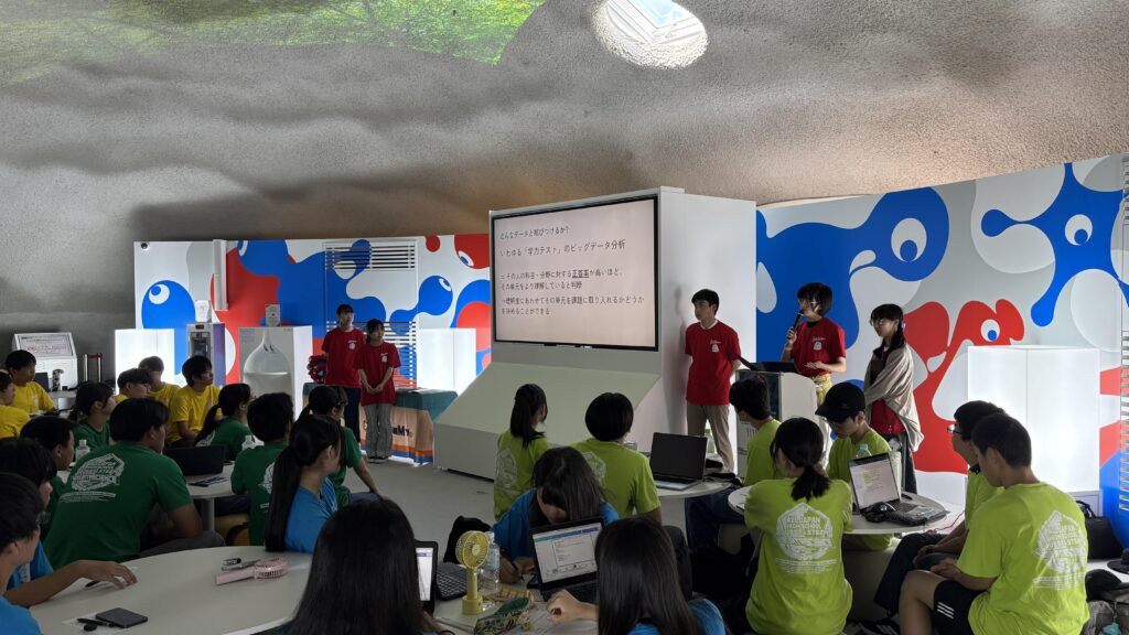 2日目からは万博会場に入り、出場生徒全員で「三菱みらい館」を訪問。最先端技術が描く未来社会のビジョンに触れました。その後、日本館や自分たちで希望するパビリオンを訪問しながら、PCとスクーミーを用いて環境データを計測しました。夕方には各チームでデータを整理し、プレゼン資料の作成を進めました。