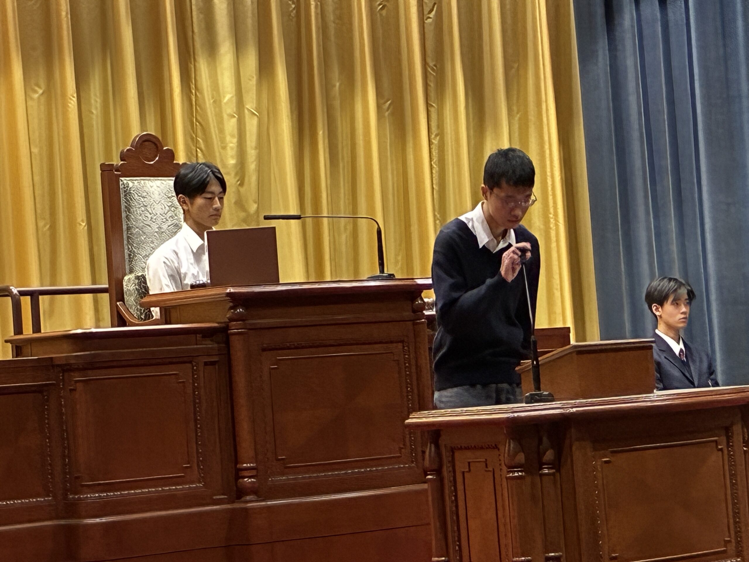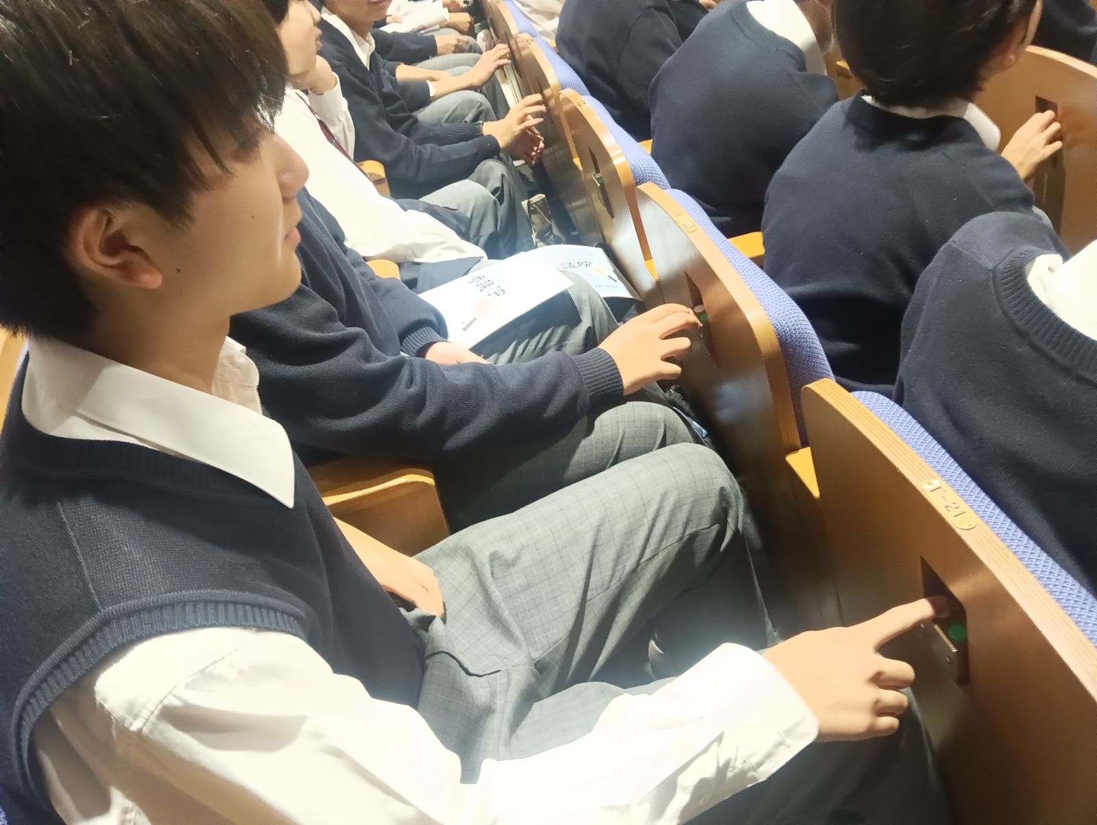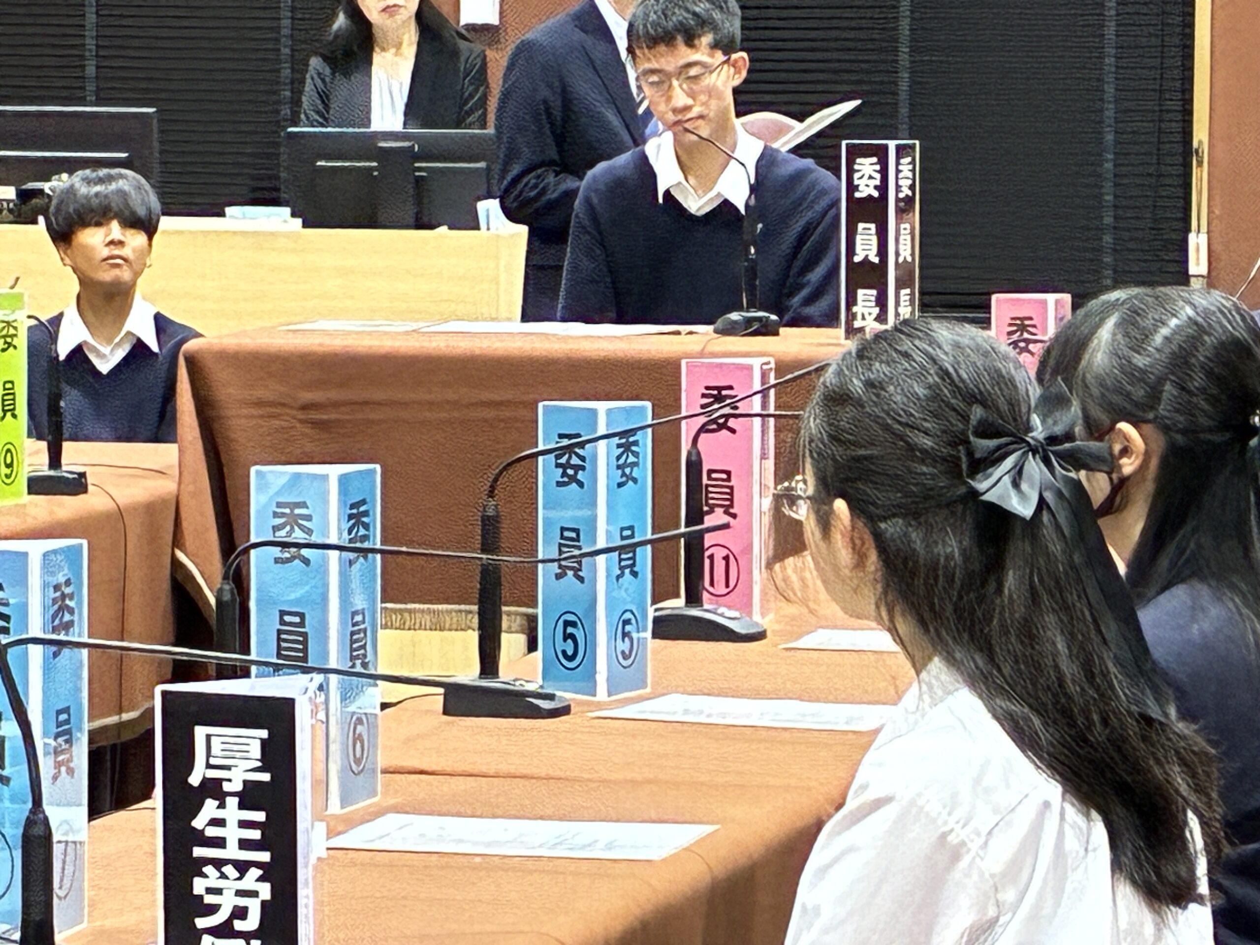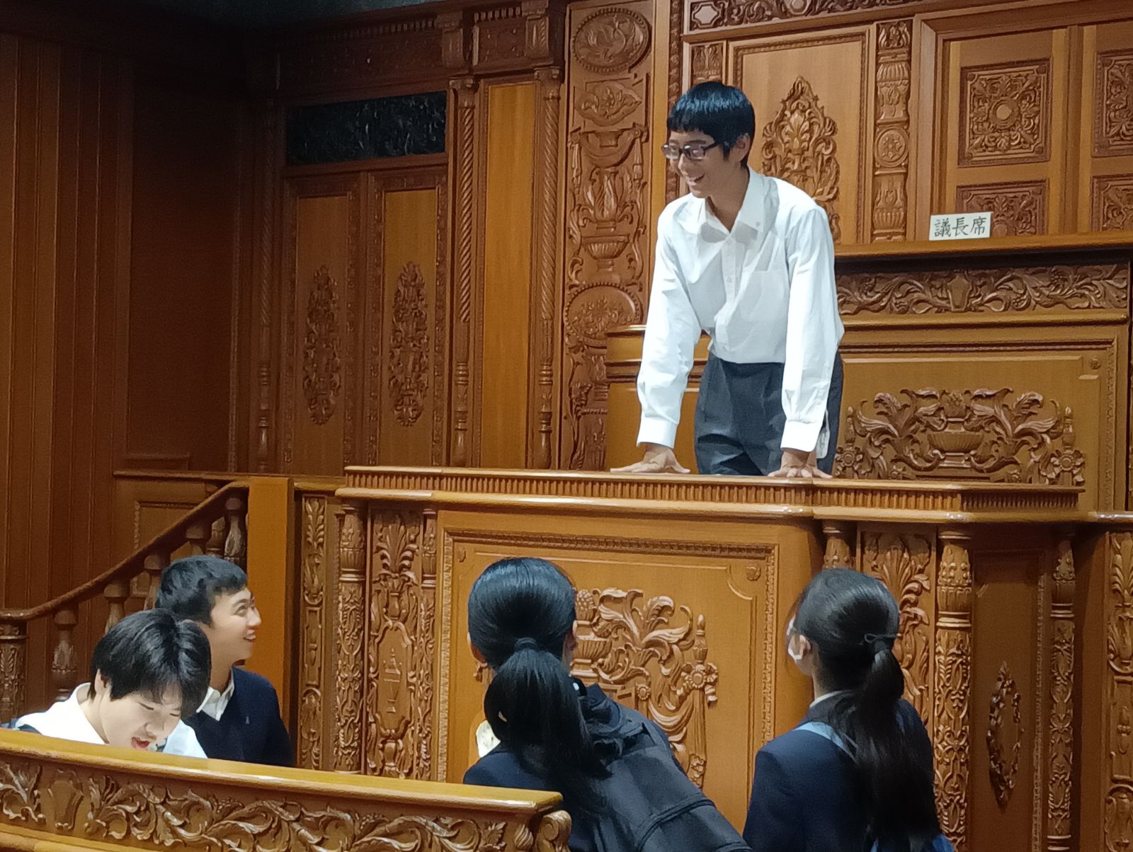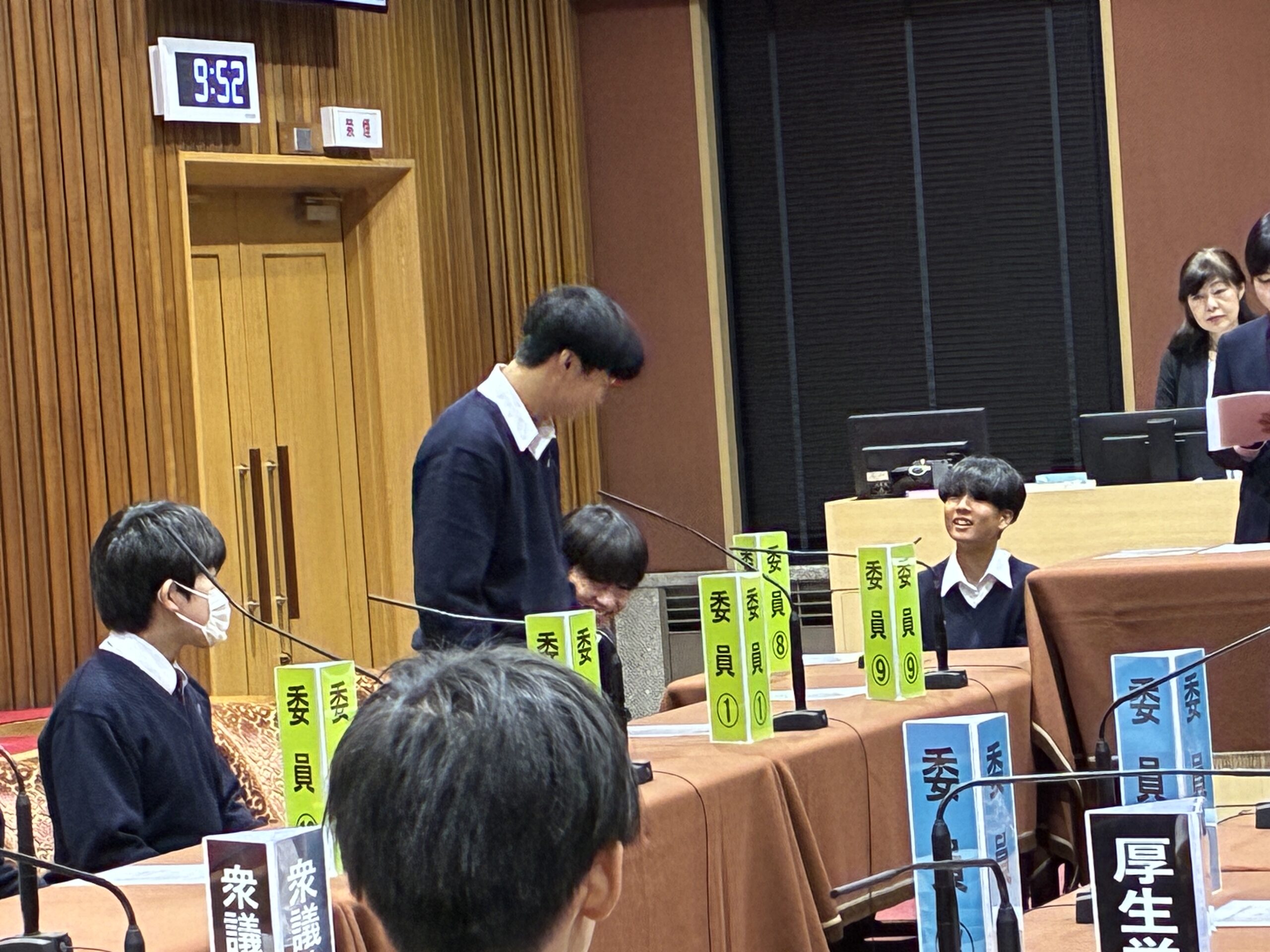 まず最初に訪れたのは参議院です。ここでは模擬法案の話し合いの様子を、代表生徒たちが参議院議長、委員長、大臣、法案提案者、委員の役になりきり再現しました。議論終了後、聴衆していた生徒たちは、賛成か反対か、ボタンを押して投票しました。実際に演じて体験したことで、一つの法案が可決されるまでの流れを掴むことができました。