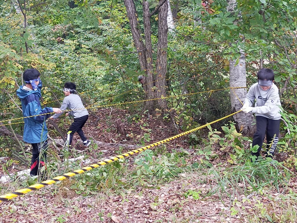 2日目は様々な体験をしました。「五感を使う」というテーマの学びでは、目隠しをして茂みの中をロープを頼りに進んでいくことで、視覚以外の感覚を研ぎ澄ませました。