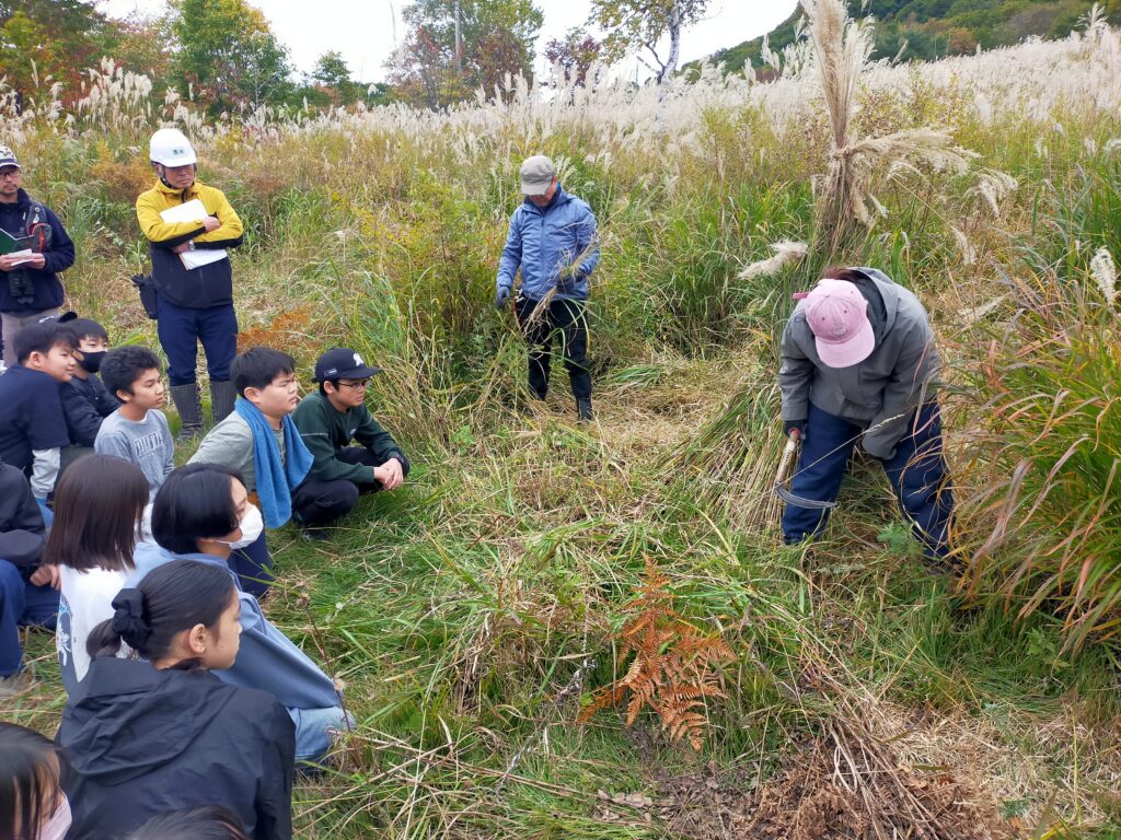 上ノ原では茅刈りの説明を受け、各クラスの代表者が実際に体験しました。茅葺屋根が使われている雲越家を訪れ、刈り取られた茅がどのように使われているのかを学びました。
