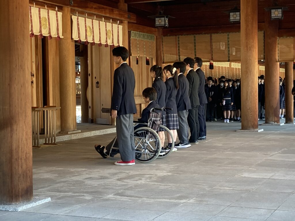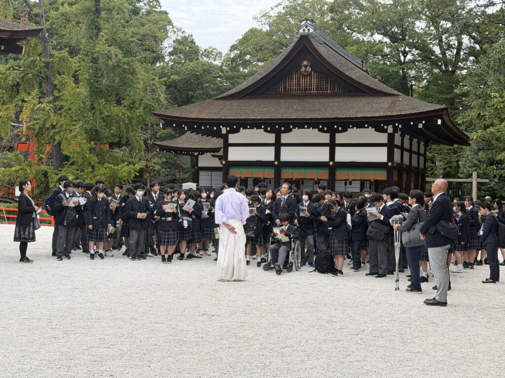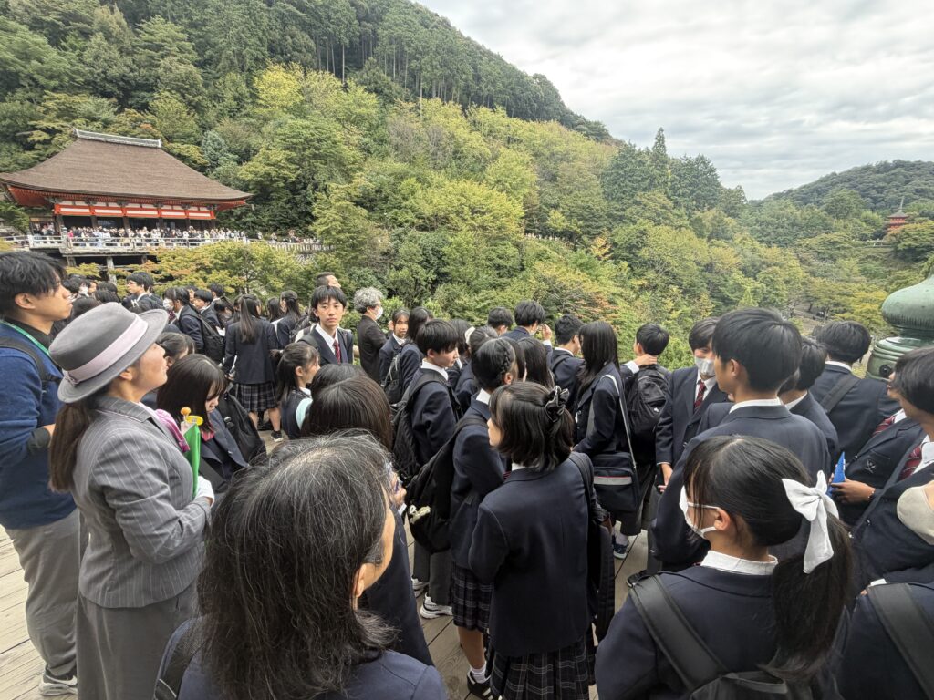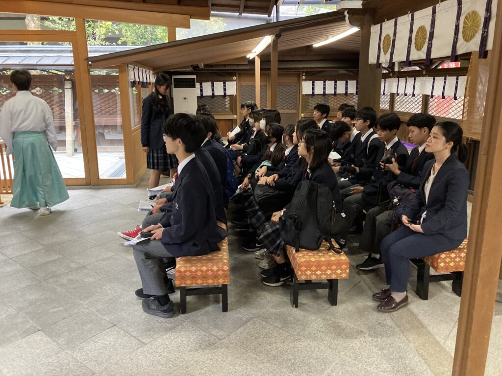 1日目は東京駅に集合し、新幹線で京都駅へ向かいました。下鴨神社で参拝を行い、神職の方の話を聞きました。下鴨神社での自由時間では多くの生徒が、水みくじを購入し、御手洗川に浸して浮かびあがる結果を嬉しそうに見せ合っていました。次に清水寺を訪問しました。清水の舞台からの景色にたくさんの生徒が感動していました。その後の自由行動では、清水寺の懸造りを見て驚いたり、音羽の滝で清水を実際に飲んでみたり、お土産を買って楽しんだりと、充実した時間が過ごせました。1日目の夜は、レク係の生徒が企画をしてくれた学年レクを行いました。大盛り上がりでした。