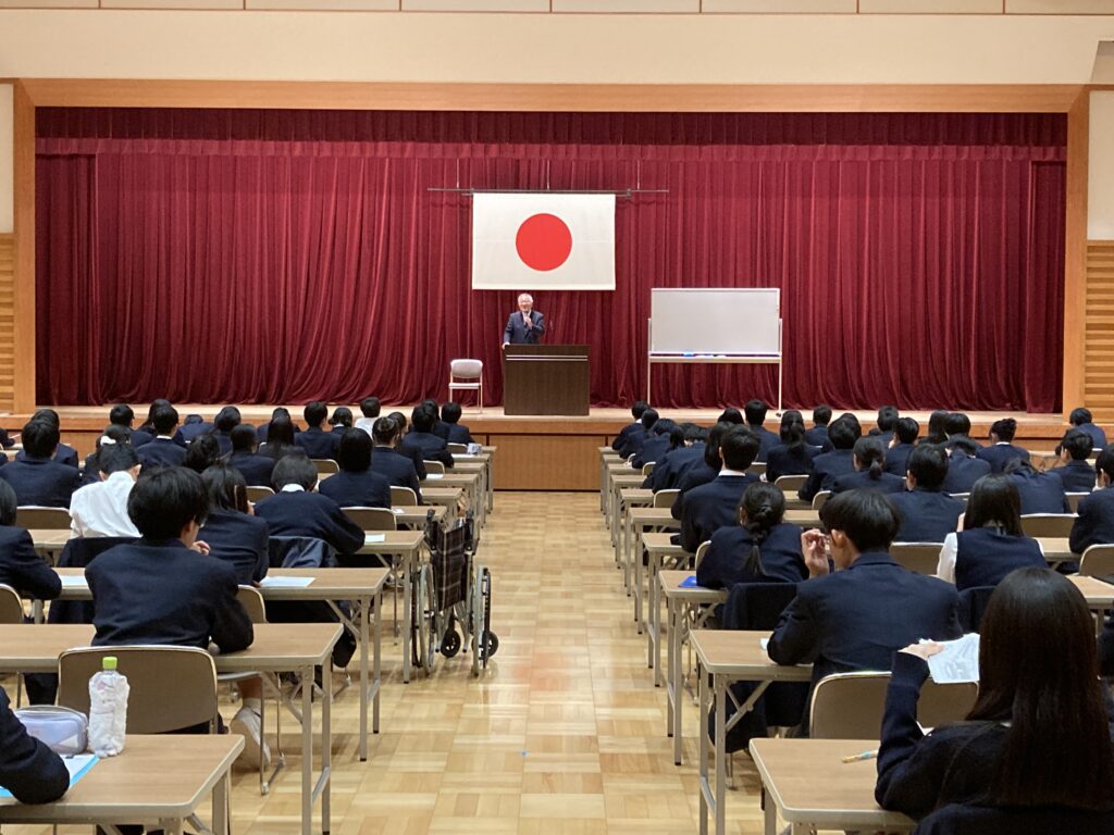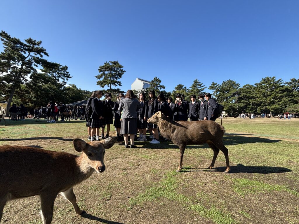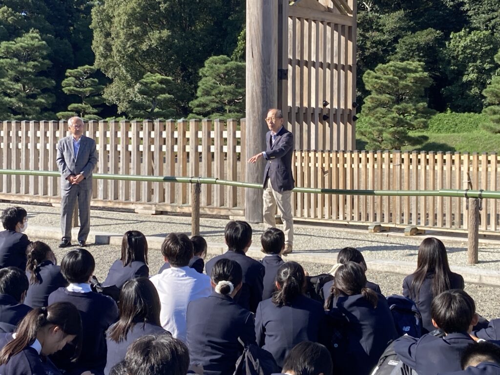 3日目は、奈良公園で班別の自由行動を行いました。事前に「東大寺」「興福寺」「春日大社」のうち2カ所行くことを目標として伝え、班でどこにいくか計画を立ててから研修旅行にいきました。自由行動の時間には、英語の授業内で練習していた、外国人観光客の方へ英語でインタビューをする活動も行いました。どの班も今まで習ってきた表現を精一杯活用し、観光客との会話を楽しめていました。その後、神武天皇の陵墓を訪問し、麗澤高校卒業生である講師の井上裕史様の話を聞きました。また、神武天皇を祀る橿原神宮を訪問し、正式参拝を行いました。この日の夜は、伊勢市生まれで、麗澤高校卒業生である山中一孝様より日本の成り立ちと神話について講話をして頂きました。
