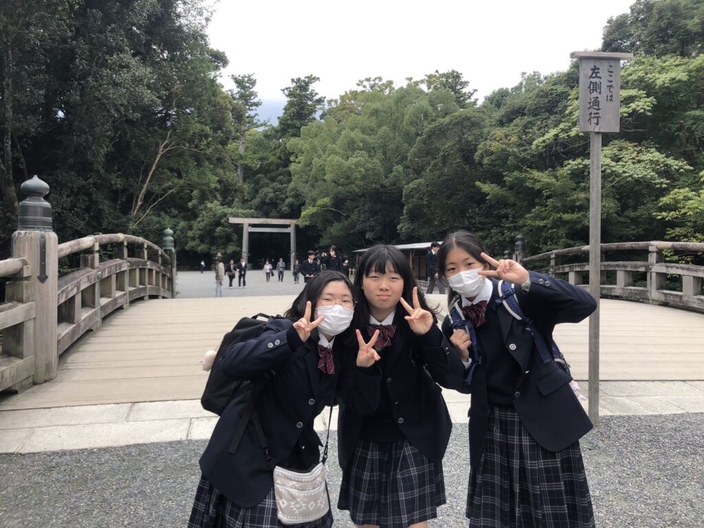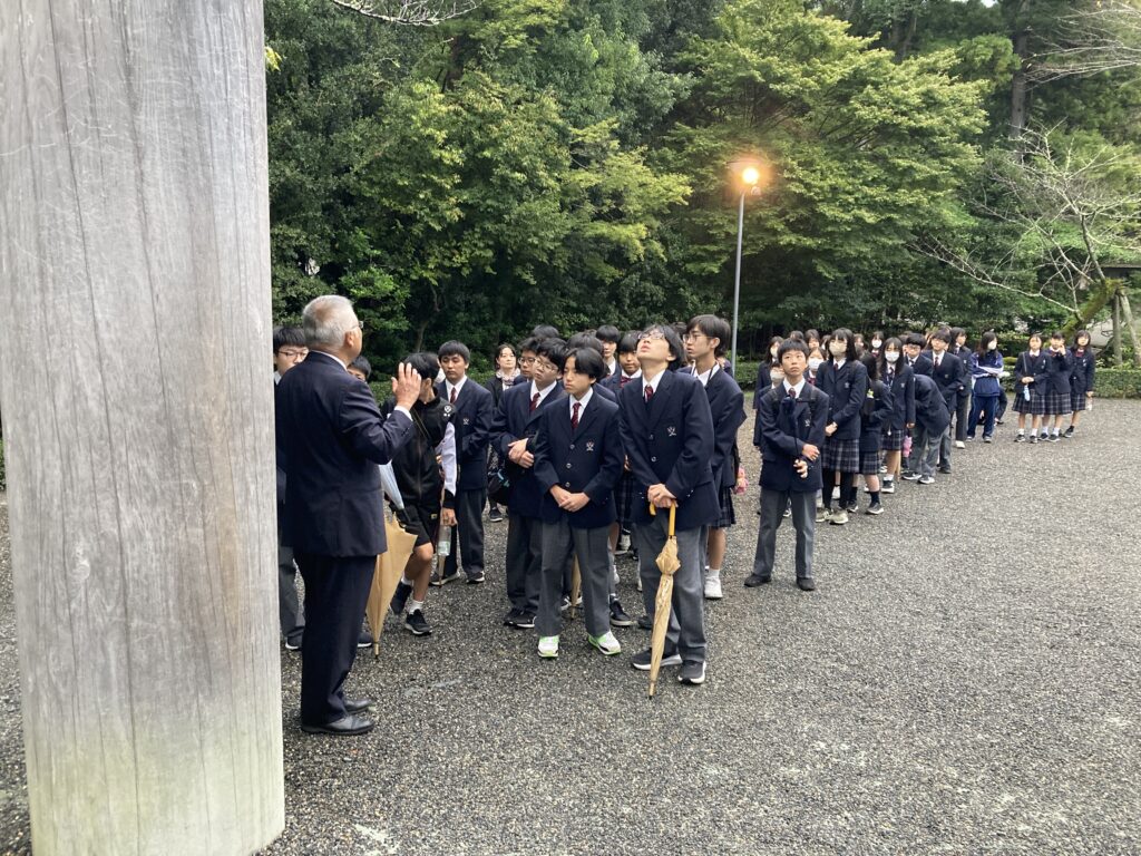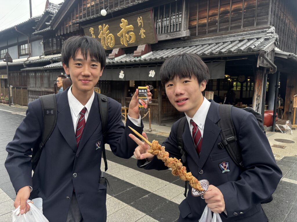 4日目、希望者は山中一孝様と早朝参拝に行くことができました。少し雨も降っていましたが、朝の静かで厳かな雰囲気の内宮を生徒たちは感じられたと思います。伊勢神宮では内宮、外宮を参拝し、ガイドさんの説明を受けました。ガイドさんの話と、これまで学んできた神話についての知識が紐づくことで深い理解ができたようです。おかげ横丁は自由散策し、名物である赤福などをお土産に買う生徒の姿が見られました。