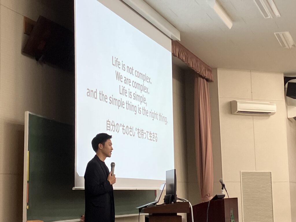 今回の講話では、「守・破・離」をメインテーマに、ご自身の経験をもとにした物事の多様な捉え方や、「自分の“ものさし”を持って生きる」「Life is simple.」といった考え方についてお話しくださいました。高校時代や寮生活で人間として大切な“型”を学んだこと、海外大学生活で文化や常識の違いを肌で実感したことから、「自分の“ものさし”を持って生きる」ことの重要性を感じたこと、また、物事を難しくしているのは、様々な言い訳をしてしまう自分自身であり、人生は案外シンプルであること、日系大企業・外資系企業・スタートアップ企業での勤務経験を通して「自分がいいと思うこと、今を生きること」の大切さを実感していることなどを話してくださいました。