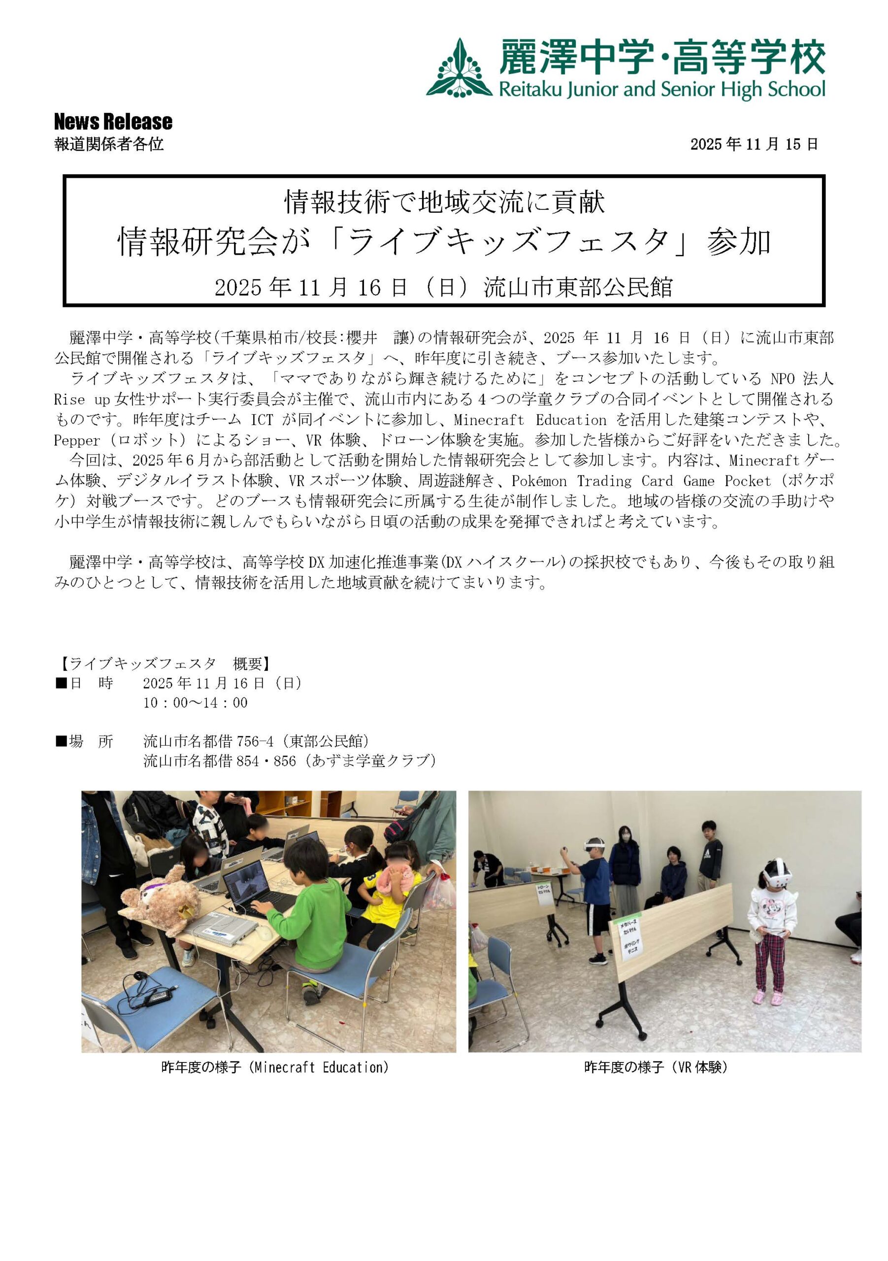 【プレスリリース】「情報技術で地域交流に貢献 情報研究会が「ライブキッズフェスタ」参加 2025年11月16日(日)流山市東部公民館」