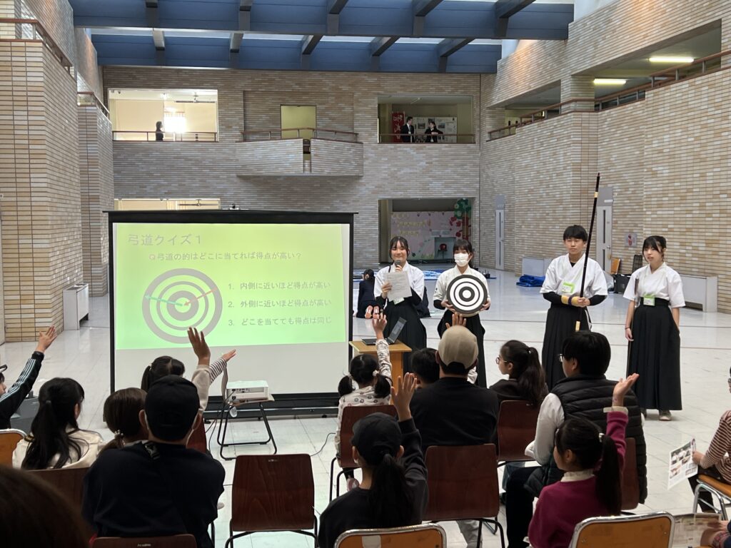 弓道研究会に所属する中学3年生の4人のメンバーで、日頃の活動紹介に加えて、弓道の実技体験コーナーを実施しました。