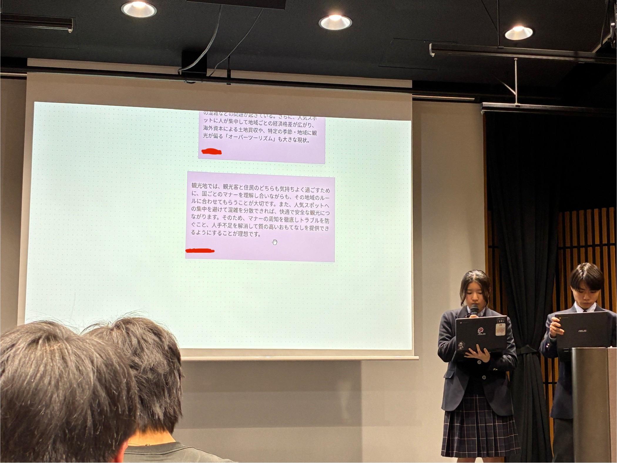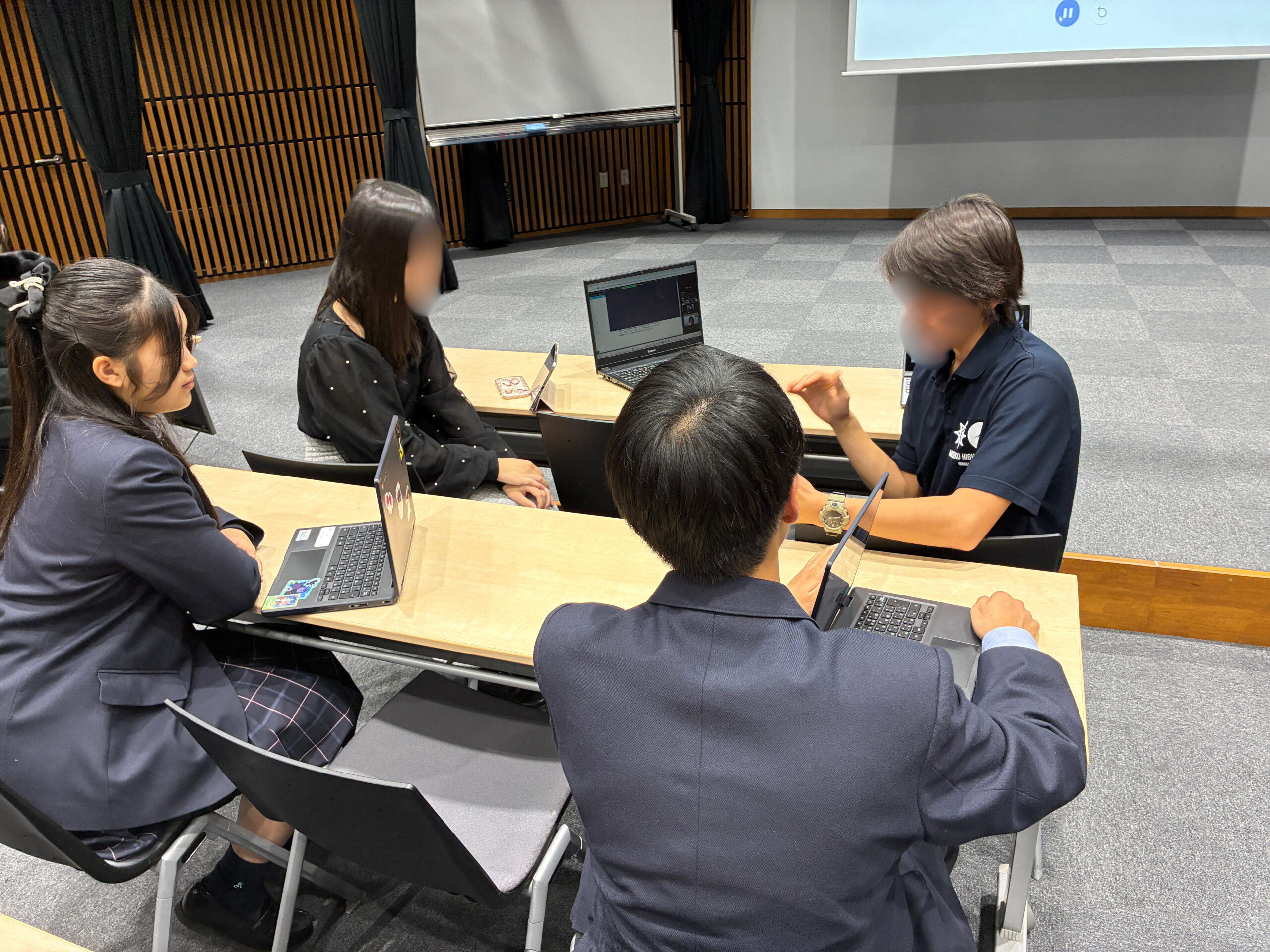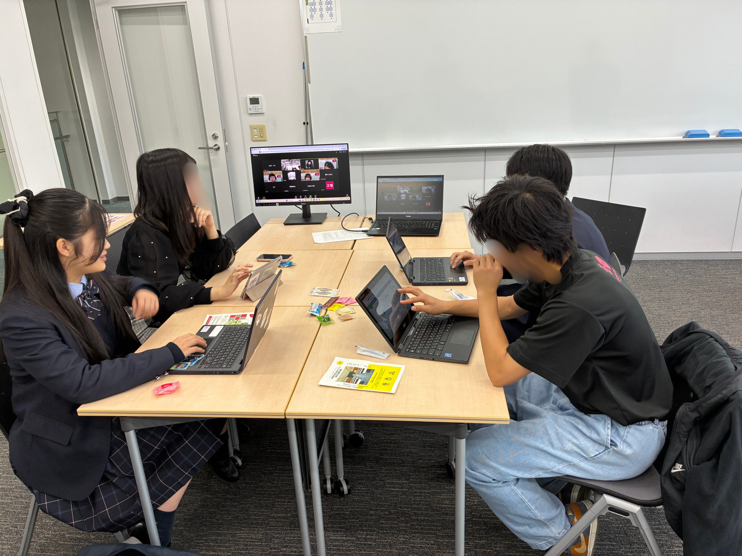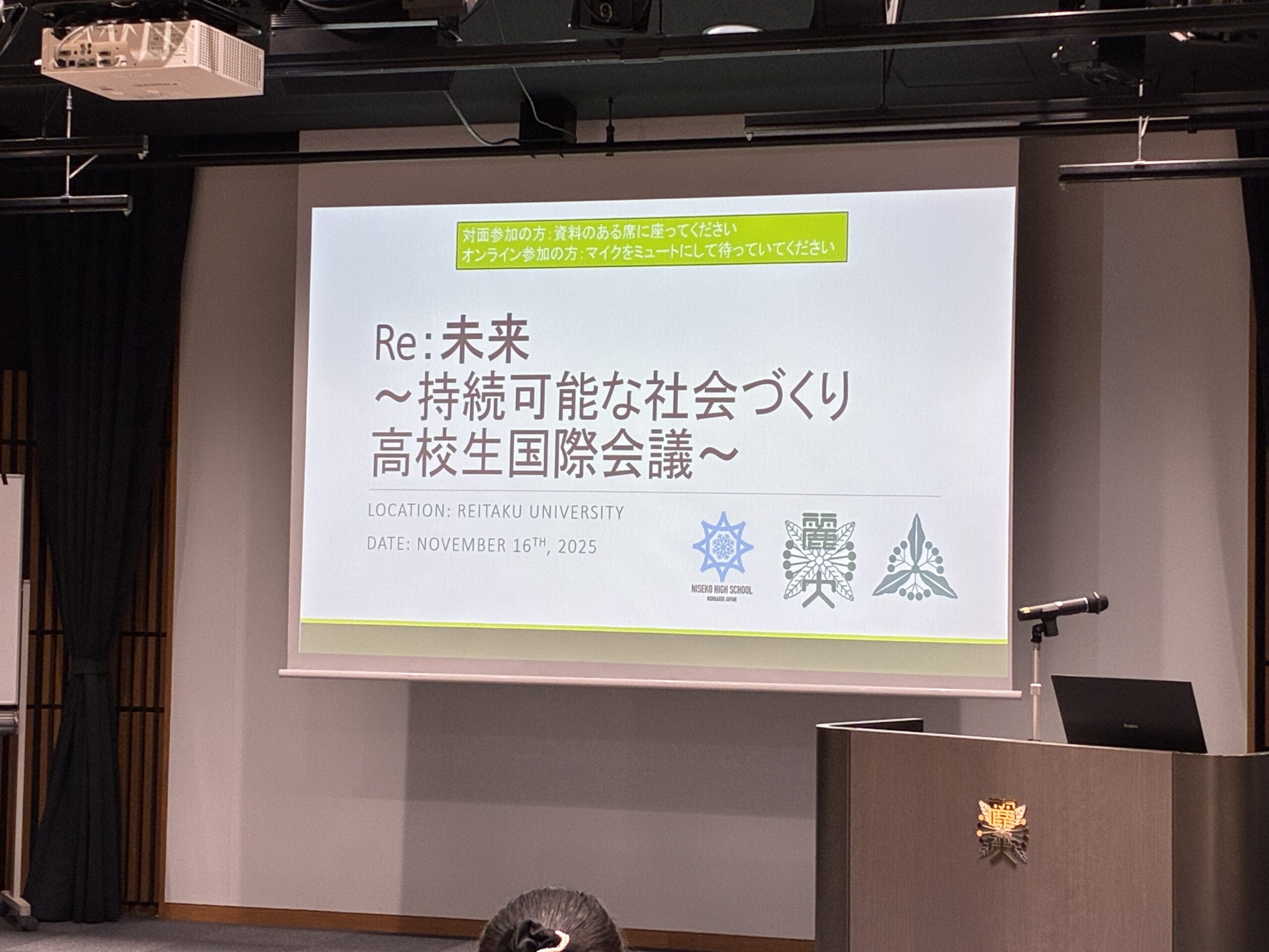 11月16日(木)、「Re:未来〜持続可能な社会づくり高校生国際会議〜」が本学園の生涯学習プラザにて開催され、本校からは「語学ゼミ」に所属する高校生8名が参加しました。 この会議は、令和7年度高等学校DX加速化推進事業(DXハイスクール)採択校である北海道ニセコ高等学校と本校が共催で企画したものです。持続可能な社会の実現に向けて、様々な国や地域の高校生がICTを活用しながら意見を交わすことで「グローバルな視野と多様な価値観、実践的なアイデアと課題解決力、共感とつながりのネットワーク」を身につけることを目的としています。北海道ニセコ高校をはじめ、本校を含む国内4校から19名の高校生が会場に集まり、さらにタイと台湾からも多くの生徒・学生がオンラインで参加しました。