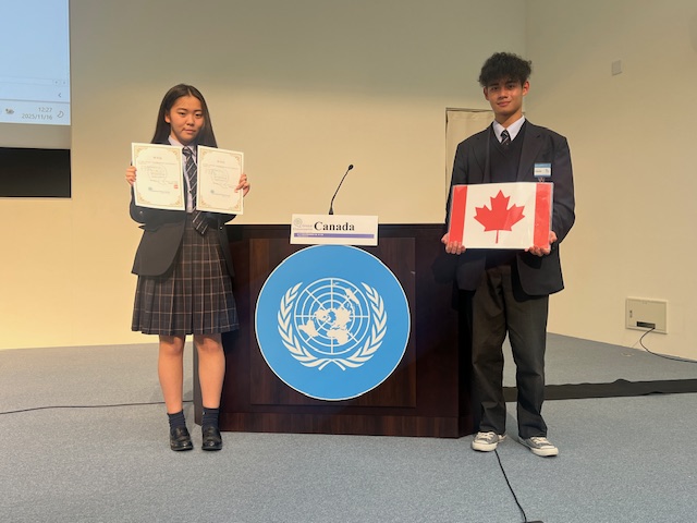 本校チームはカナダ大使として参加し、事前準備として政策リサーチ、ポジションペーパーの作成、スピーチ原稿の構築、各国方針の分析など、数ヶ月にわたり綿密な準備を重ねてきました。また、議題に関係する国内外のニュース、政府報告書、国際機関の資料を読み込み、自国の外交姿勢に基づいた一貫性のある政策立案に努めました。