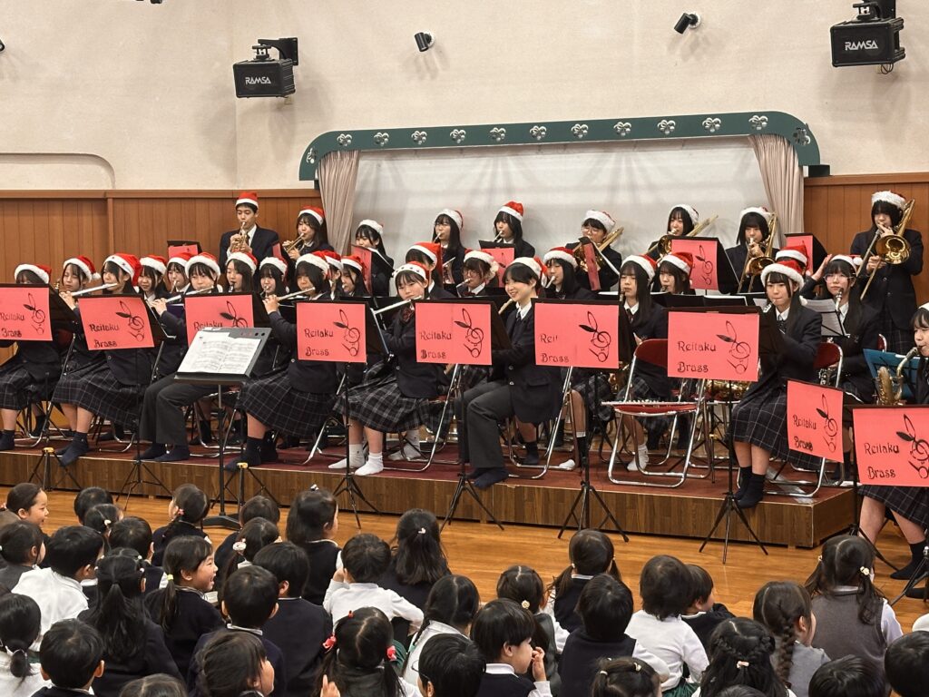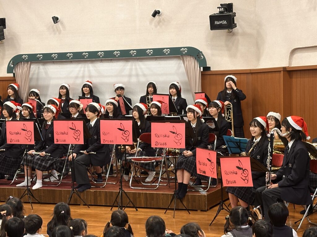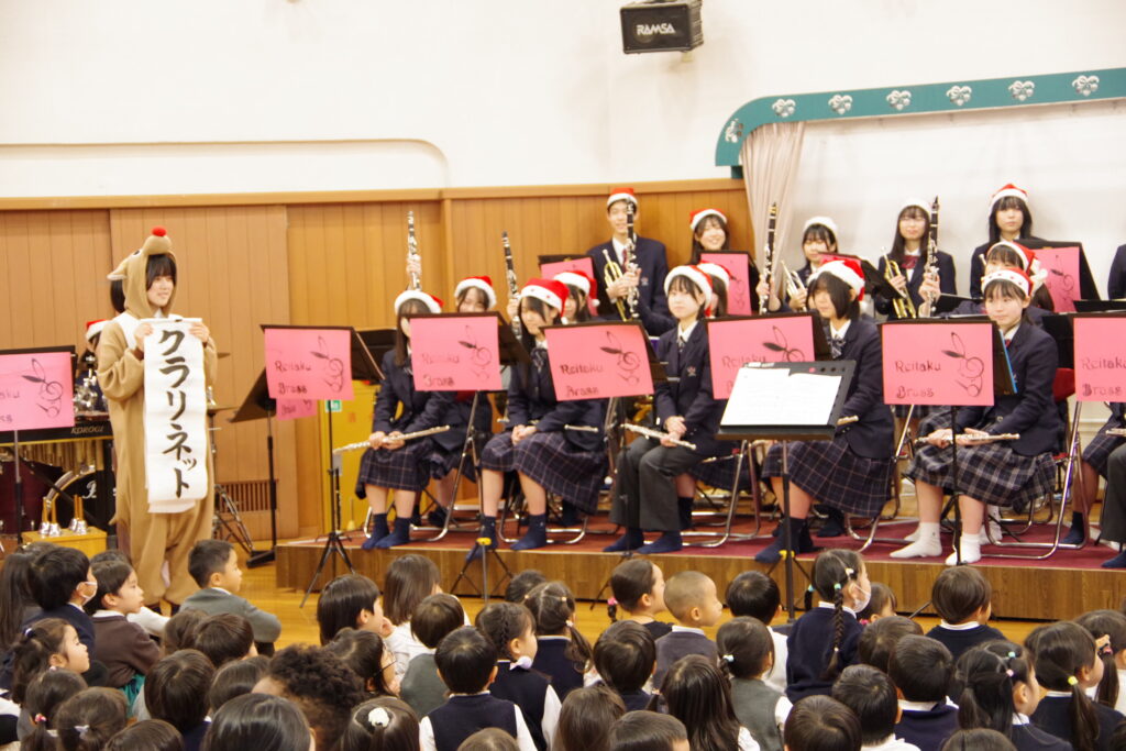 高校1、2年生のほか、仮入部中の中学3年生も参加し、定番のクリスマスソングである「赤鼻のトナカイ」「あわてんぼうのサンタクロース」や、事前に幼稚園の先生に伺った子どもたちの人気曲「夢をかなえてドラえもん」「ジャンボリミッキー」を演奏しました。