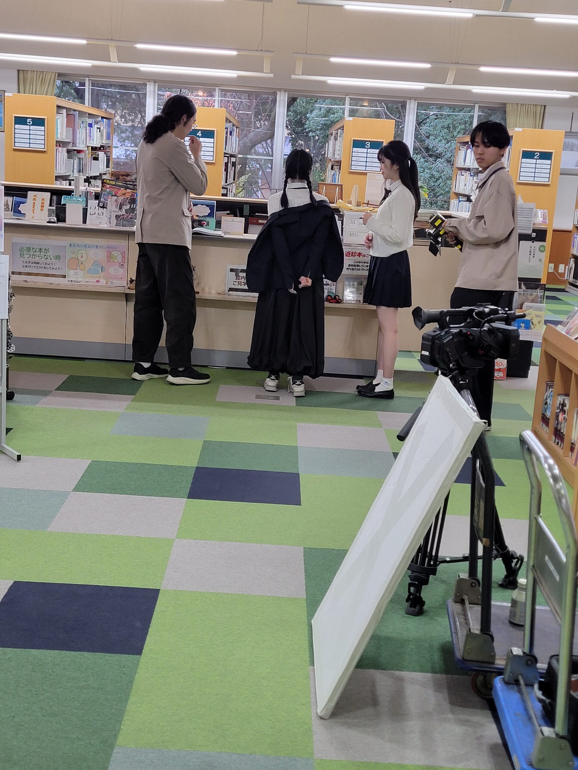 本撮影はゼミの課題の一環として実施されたもので、撮影スタッフ4名、キャスト5名の計9名が来校されました。