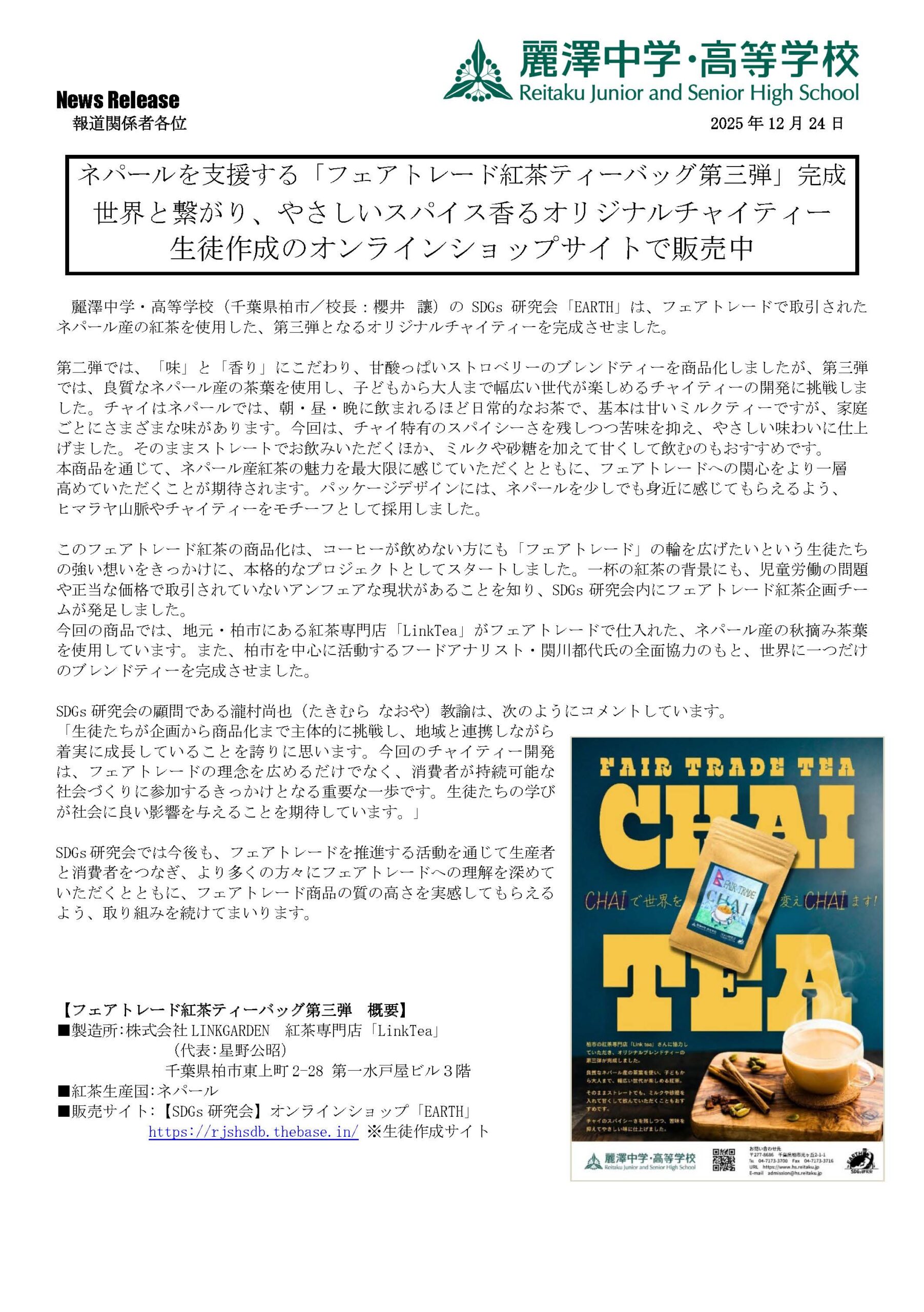 【プレスリリース】ネパールを支援する「フェアトレード紅茶ティーバッグ第三弾」完成 世界と繋がり、やさしいスパイス香るオリジナルチャイティー 生徒作成のオンラインショップサイトで販売中