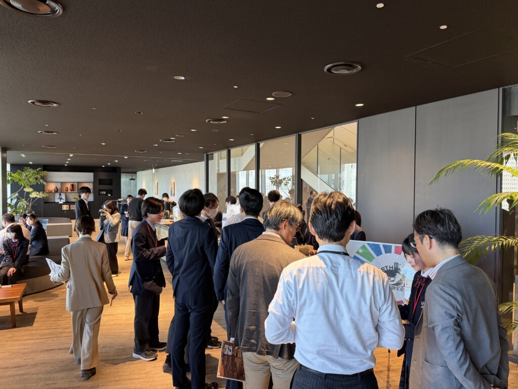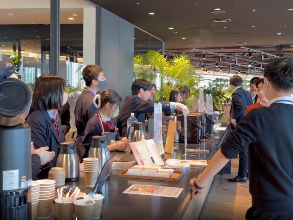 イベントでは、生徒30名が住友生命東京本社内カフェラウンジにフェアトレード商品を出店し、コーヒーもハンドドリップで提供しました。住友生命職員との対話を通じてフェアトレードやSDGsの意義を伝え、会場は行列ができるほどの盛況となりました。生徒にとっても、社会で働く人々と直接語り合うことで、自分のキャリアや社会課題への関心を深める貴重な機会となりました。