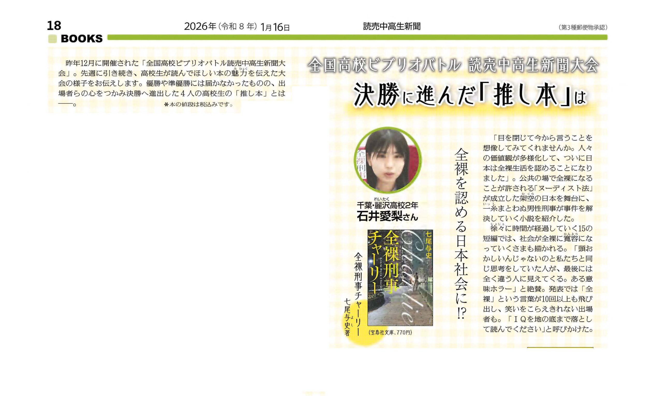昨年12月20日(土)に開催された全国高校ビブリオバトル「読売中高生新聞大会」において、決勝に進出した高校5年生・石井さんの記事が、1月16日(金)発行の読売中高生新聞に掲載されました。