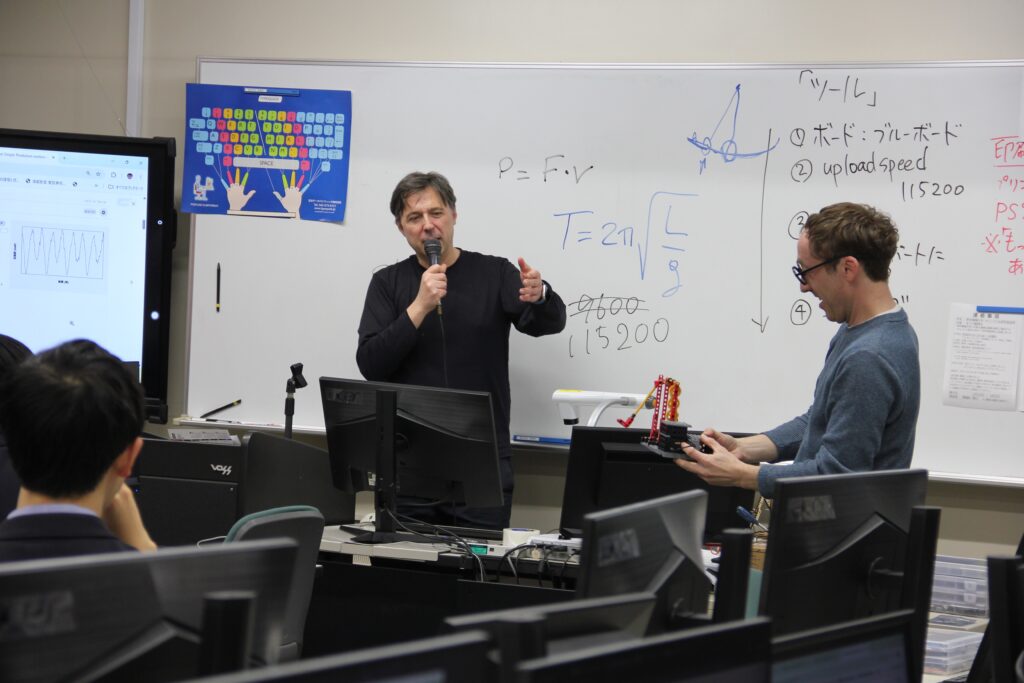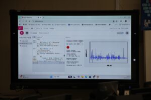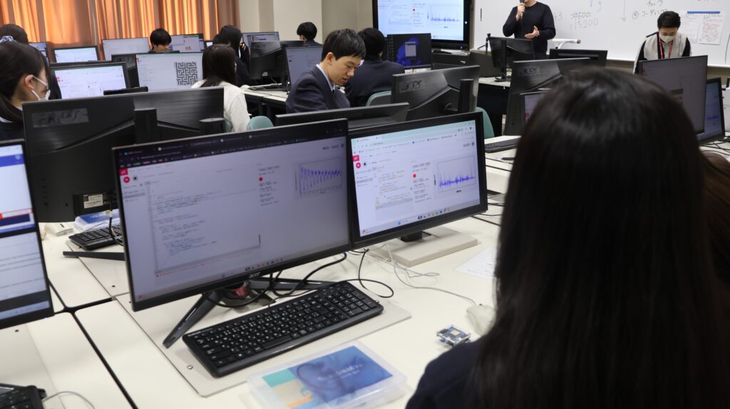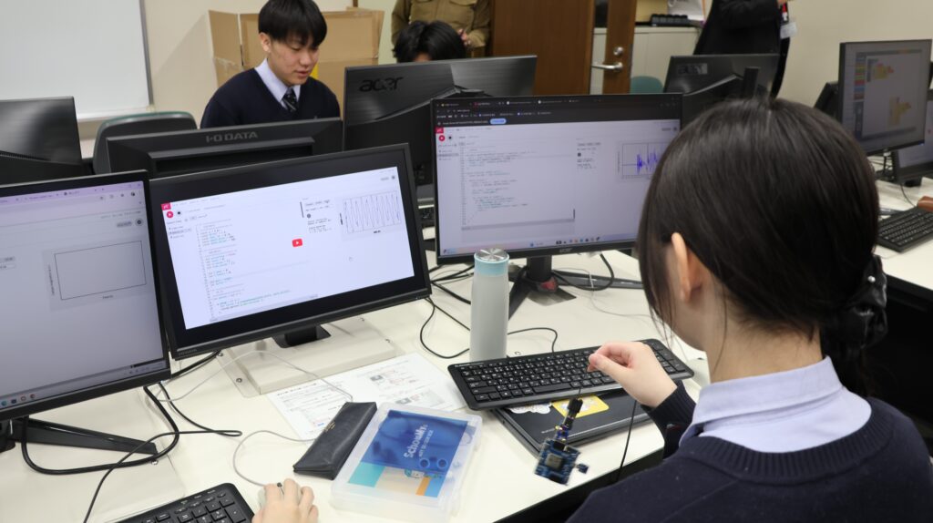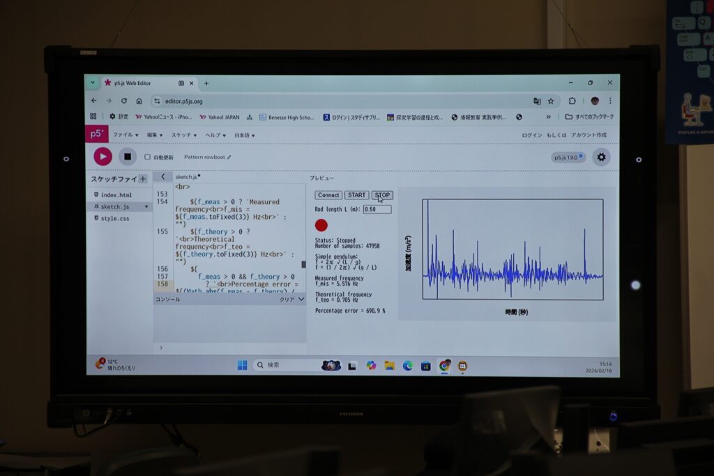 生徒たちは、センサーデータの取得、データの可視化、周期計算のアルゴリズム理解、実測値と理論値の誤差分析に取り組み、データサイエンスの基礎を体験しました。単に実験を行うのではなく、「データをどのように取得し、どのように処理し、どのように意味づけるのか」というDX時代に求められる思考プロセスを実践的に学ぶ貴重な機会となりました。