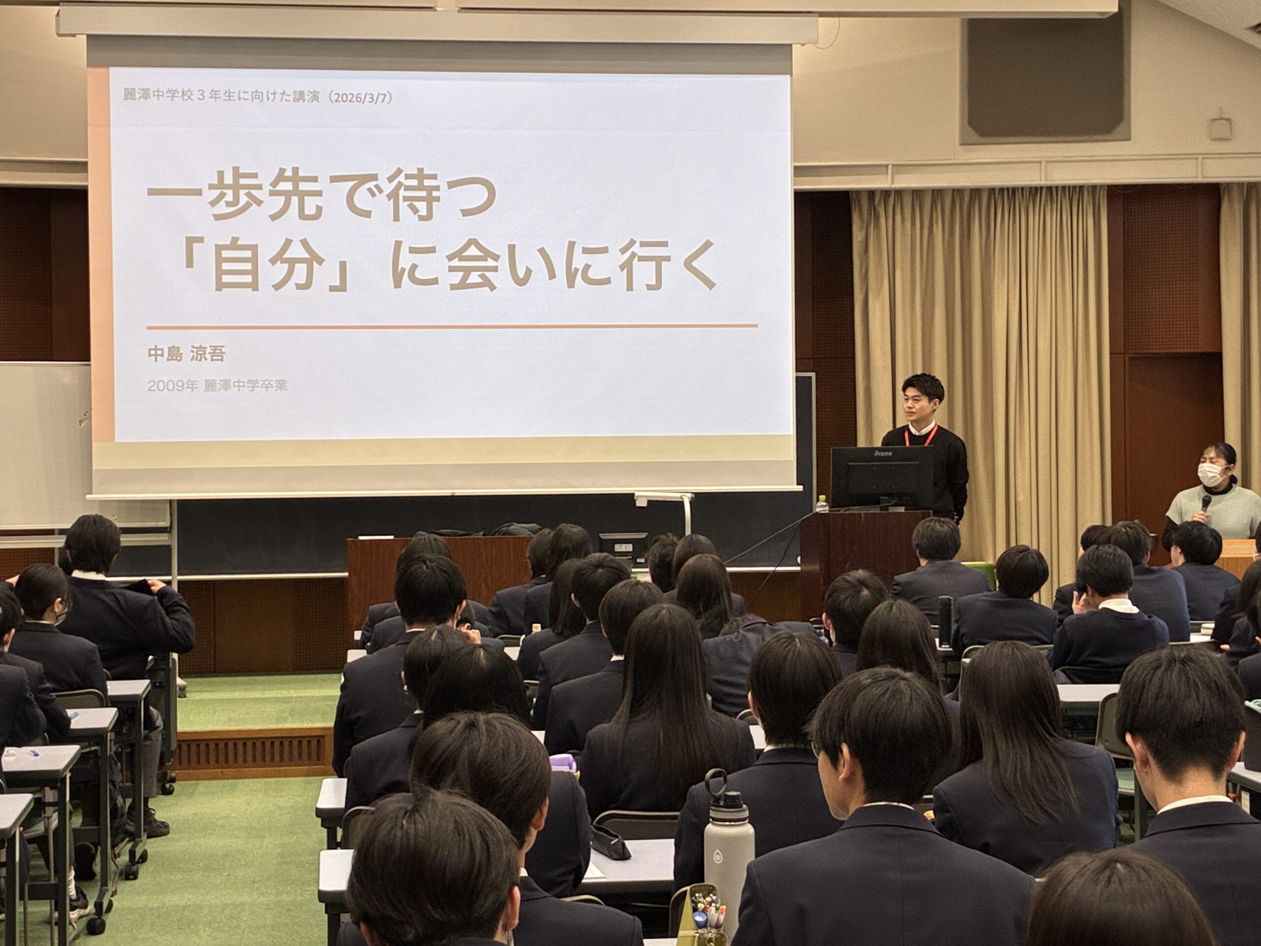 3月7日(土)、中学3年生は特別プログラムの一環として、麗澤中学5期、麗澤高校64期卒業生の中島涼吾さんをお招きし、卒業生講話を行いました。現在は海運業で脱炭素推進という地球規模の課題に挑む中島さんですが、中学時代の海外研修や高校時代に受けた講話から大きな影響を受けたようです。