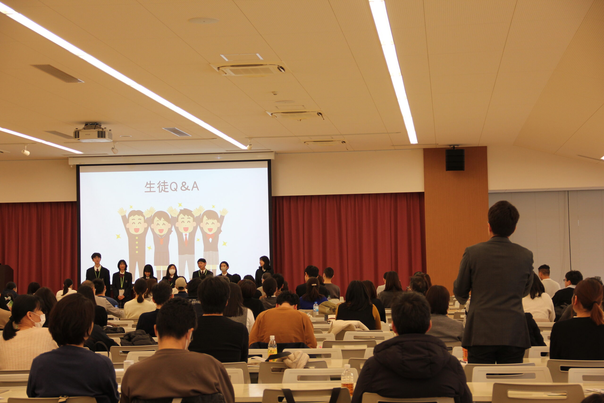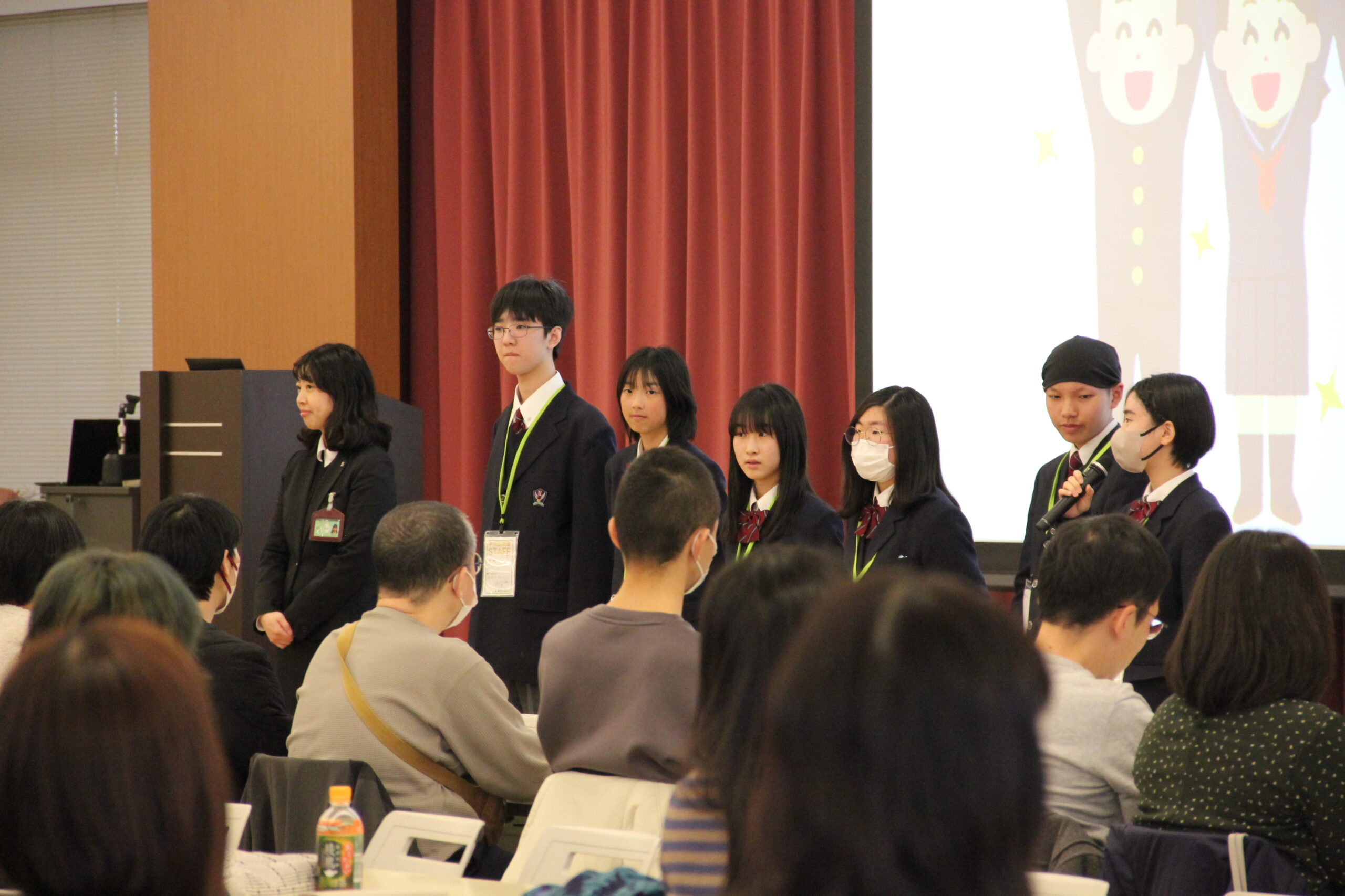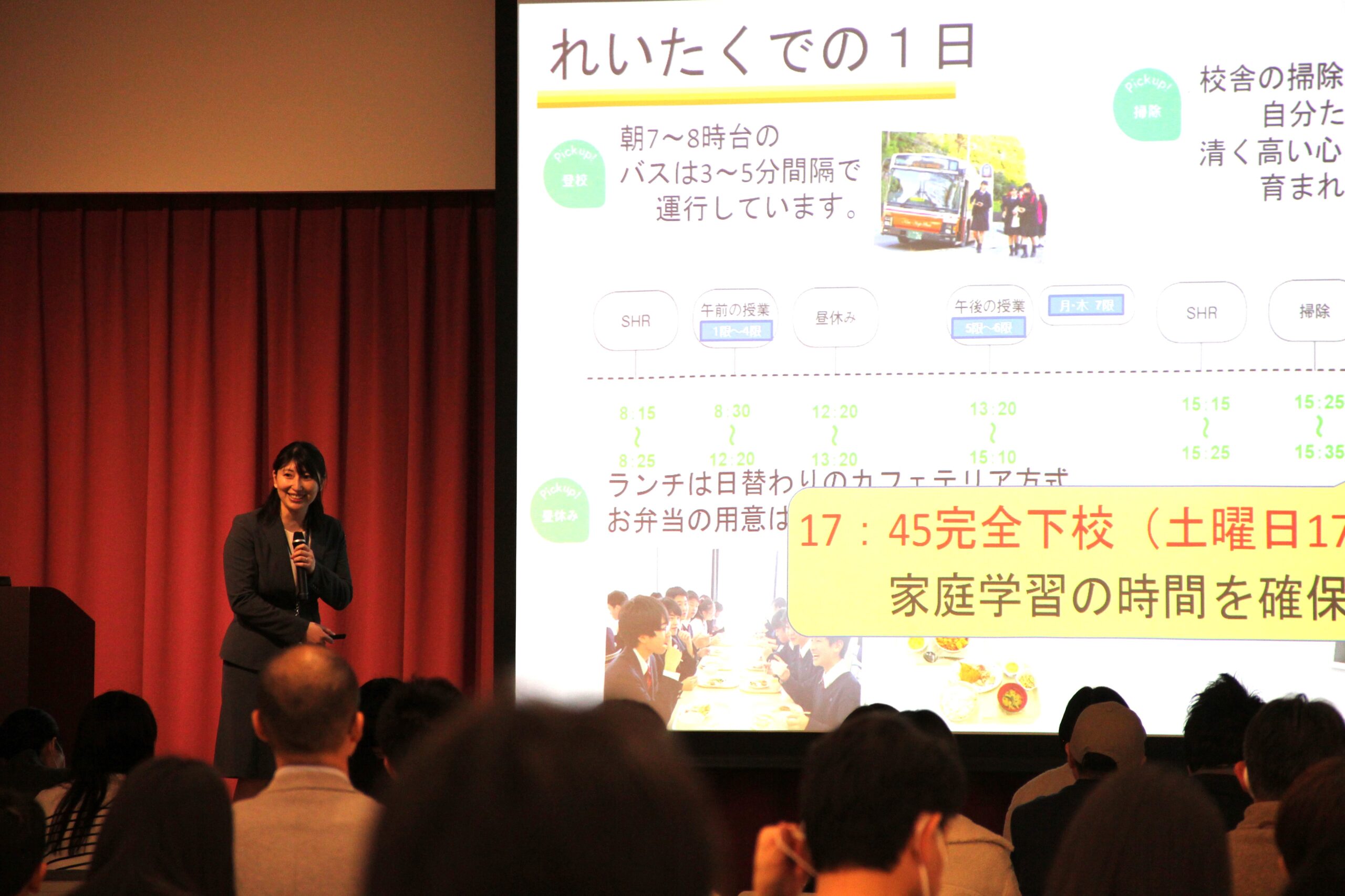 限られた時間ではありましたが、「休憩時間はどんなことをしていますか」「〇〇部はどのような部活ですか」など、たくさんのご質問をいただき、一生懸命答える生徒たちの声を、保護者の皆様も真剣に聴き入っていただいているようでした。