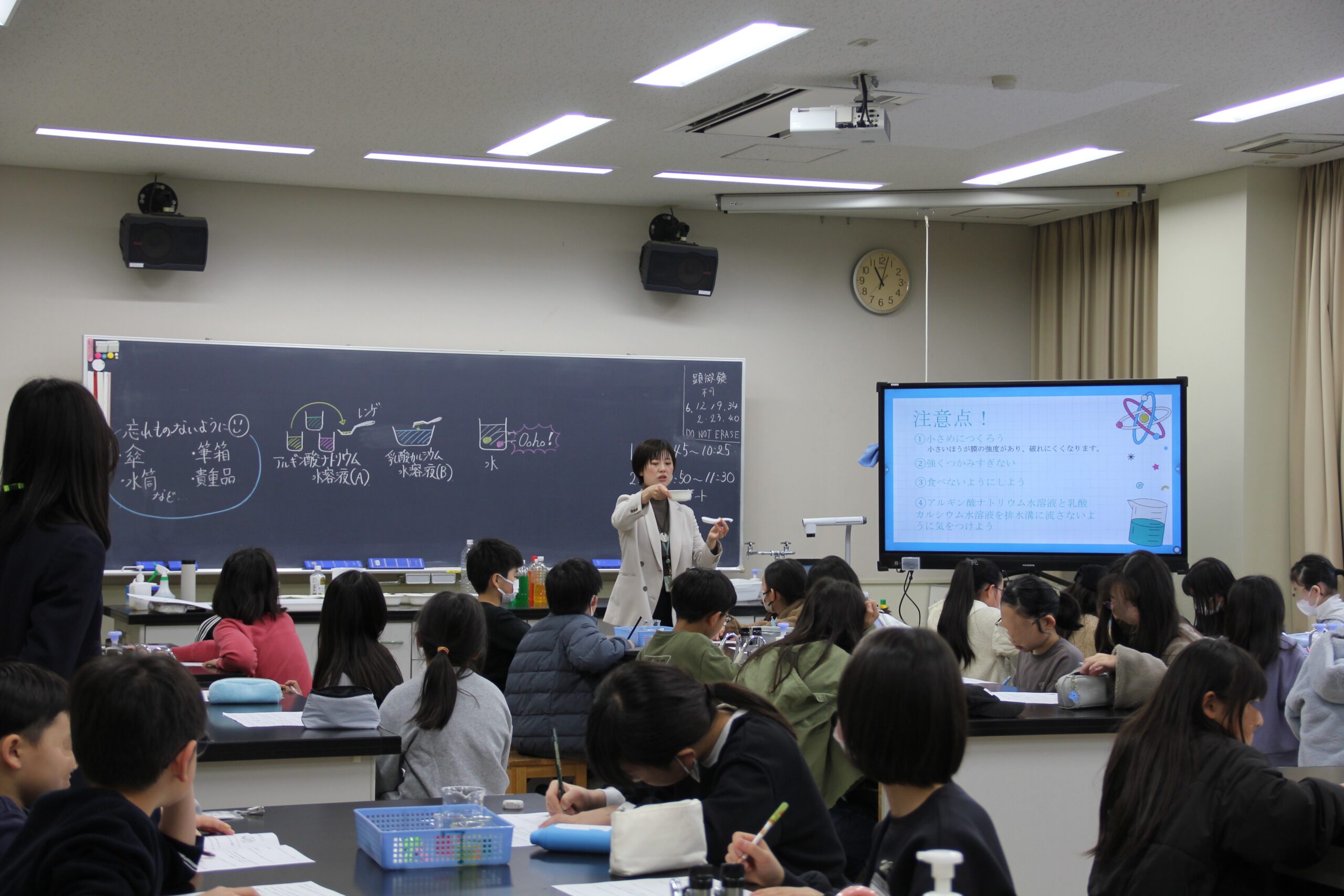 新6年生は、本校独自の教科である「言語技術」の授業と、受験にも役立つ社会の授業を体験。新4・5年生は、理科の実験と、グローバル教員と日本人教員による英語の授業を体験していただきました。