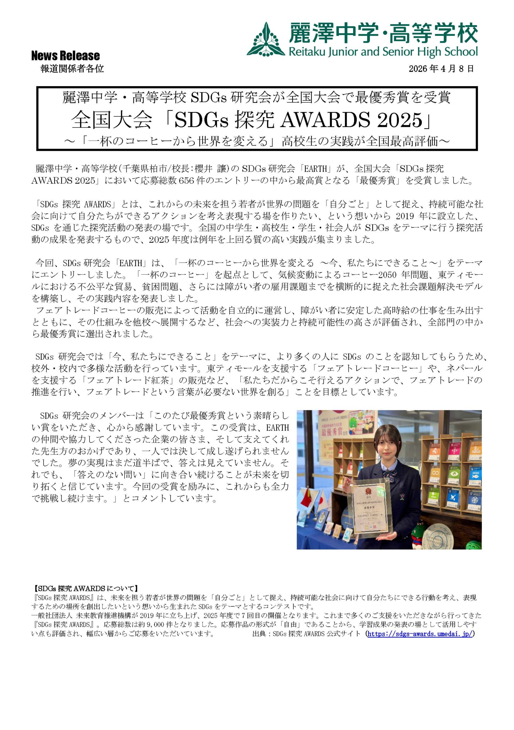 【プレスリリース】麗澤中学・高等学校 SDGs研究会が全国大会で最優秀賞を受賞 全国大会「SDGs探究AWARDS 2025」 ~「一杯のコーヒーから世界を変える」高校生の実践が全国最高評価~