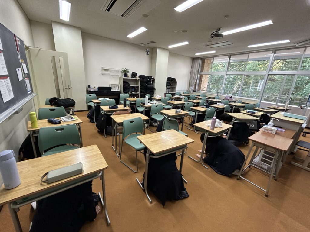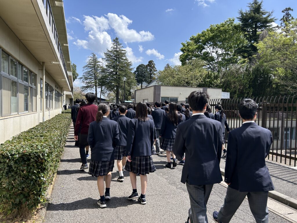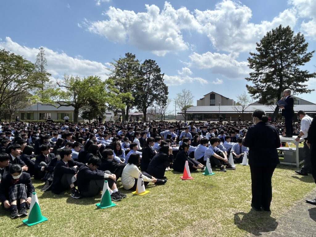 4月11日(土)、学校全体で避難訓練を実施しました。訓練では、土曜日の帰りのSHR中に地震が発生したことを想定し、生徒たちは机の下に身を隠した後、実際の避難経路を通って中央芝生に避難し、点呼を行いました。